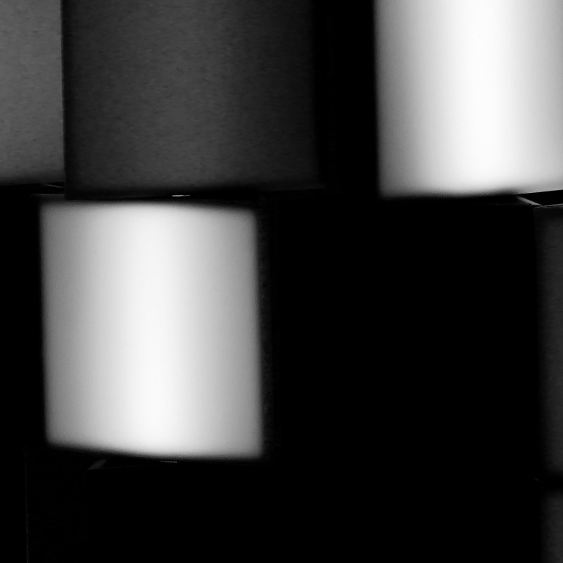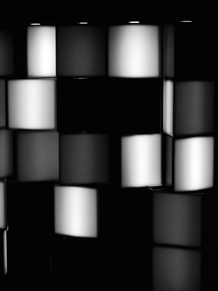 I like to take abstracted photographs of interesting objects that may inspire a particular direction in my painting and collage. Kulinyi’s design is a nod to 70’s style interiors and yet executed to feel highly contemporary. Alternating angles, neon squares mixed with diffused areas, black-outs and high gloss make for interesting texture when photographed, providing multiple options upon which to base a painting.
