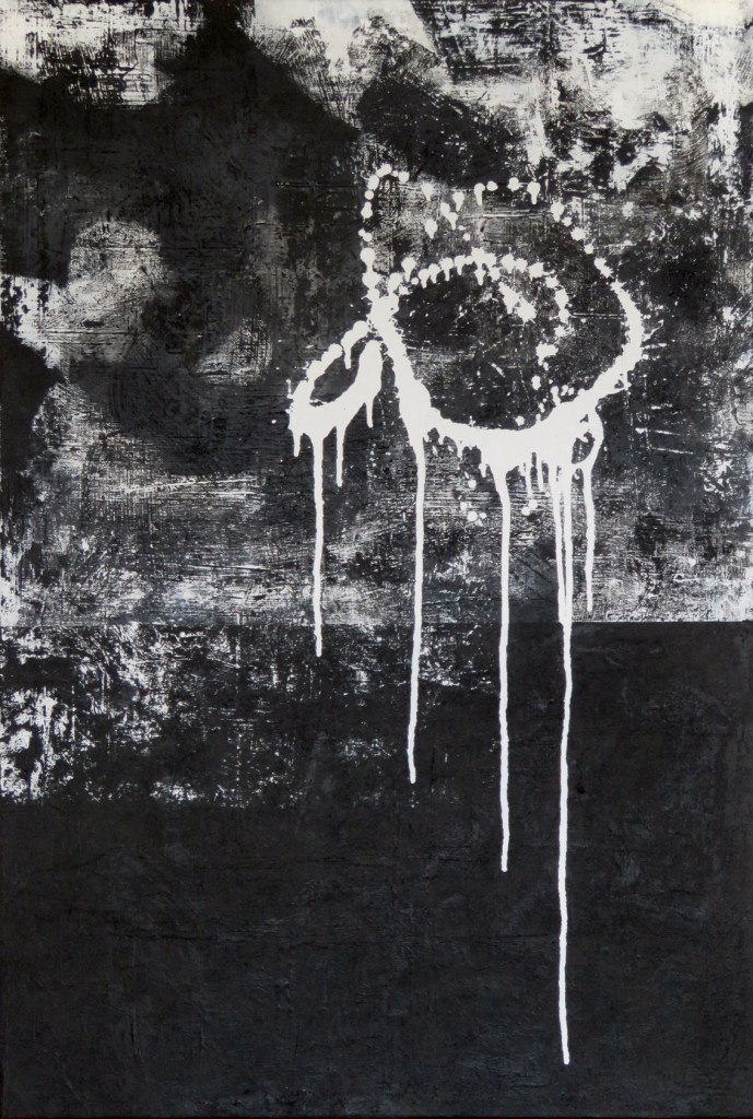 A painted response to the previous BUDA photographs taken in June of this year… another one of my canvases that has been hanging around since 2008, worked on again a couple years ago, and finally the recent photos from Budapest gave me what I needed to finish it. The ground was a couple days work on top of I don’t know how many previous days effort over previous years all spent building up the texture, so there was some angst about achieving the appropriate viscosity of the white pouring paint. I had the intent to create something approximating an infinity loop, however, the triple infinity loop is pure chance. So in honour of my incredible trip to Budapest, BUDAPEST… likely to be featuring at The Other Art Fair London in October.